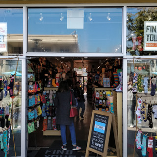 Percorrendo Haight St abbiamo incrociato una moltitudine di negozi e caffè, la maggior parte dei quali presentava colori sgargianti e motivi eccentrici. Tra di essi impossibile non citare Piedmont Boutique (1452 Haight St) con il paio di gambe femminili che escono dal primo piano e la collezione di vestiti piumati e pellicce al suo interno.